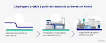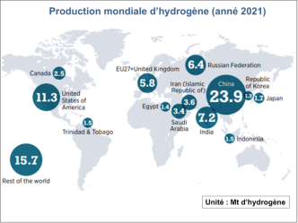 Dans le monde, près de 90 millions de tonnes d’hydrogène sont aujourd’hui produites et consommées, principalement par des raffineries, l’industrie des engrais (ammoniac) et la chimie. En quasi-totalité, cet hydrogène conventionnel est produit à partir d’énergies fossiles. Il est dit noir ou marron lorsqu’il est issu de la gazéification du charbon (houille ou lignite). C’est le cas en Australie ou en Chine, qui produit jusqu’à 33 millions de tonnes d’hydrogène carboné. L’hydrogène gris est lui produit par vaporeformage du gaz naturel, comme en France où environ 800 000 tonnes/an sont consommées. Sa production est particulièrement émettrice de gaz à effet de serre : plus de 20 kgCO2eq/kgH2 produit pour de l’hydrogène noir ou marron et 11 kgCO2eq/kgH2 pour l’hydrogène gris.