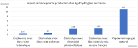 Pour le reste, on constate que la production par électrolyse peut être verte, rose ou jaune… selon la source de production de l’électricité utilisée pour produire l’hydrogène. Jaune pour le réseau électrique français ; gris ou noir pour le réseau allemand (centrale charbon, et à gaz). Enfin, l’hydrogène bleu correspond à une production d’hydrogène gris, mais avec un captage du CO2 qui de ce fait diminue l’empreinte carbone.