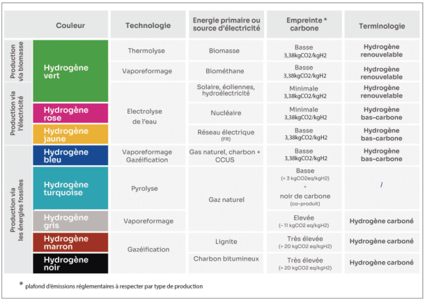 Le tableau ci-après synthétise les couleurs données aux différentes formes production de l’hydrogène [traité dans ce dossier]