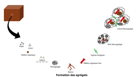 • soit être stabilisés dans les agrégats, où ils ne sont pas accessibles aux micro-organismes en raison de la barrière physique formée par les agrégats eux-mêmes autour de la matière organique,